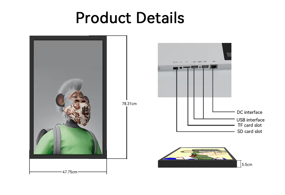 4.Πώς πολλά μεγέθη του πλαισίου οθόνης NFT; ①regular σχήμα: ορθογώνιο 10.1 ", 21.5", 32 ", 43", 55 "